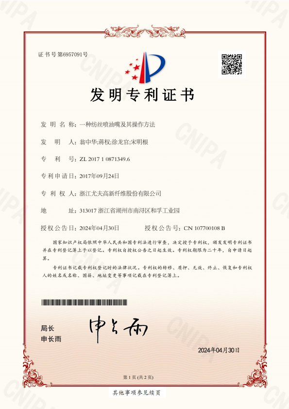 • 發明專利證書一種紡絲噴油嘴及其操作方法