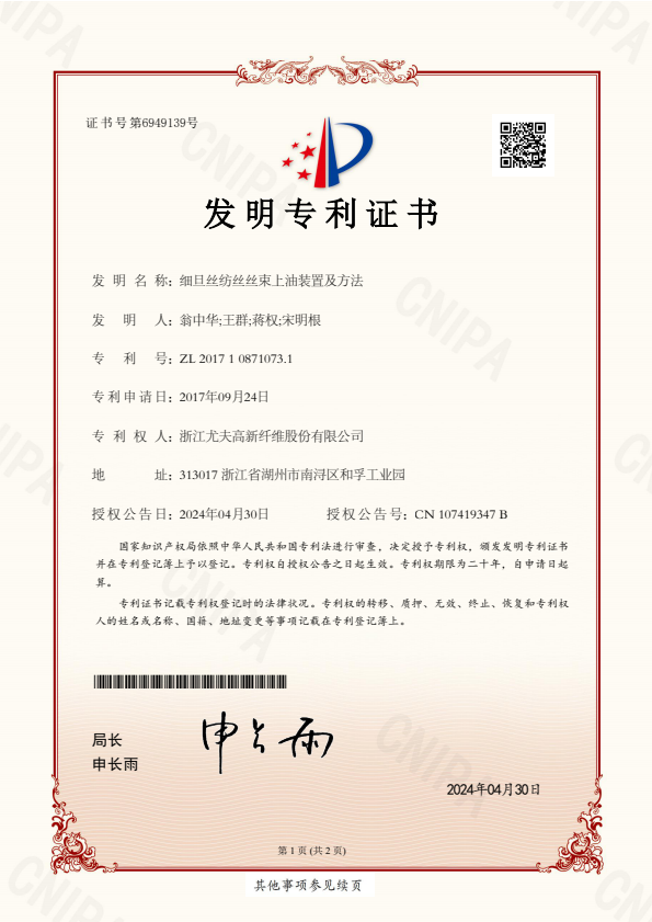 • 發明專利證書細旦絲紡絲絲束上油裝置及方法